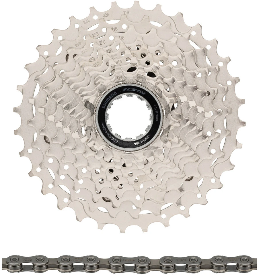 1 x Kurbelgarnitur Shimano 105 (FC-R7000)1 x Schaltwerk Shimano 105 (RD-R7000)1 x Umwerfer Shimano 105 (FD-R7000)1 Paar Schalt-/Bremsgriffe Shimano 105 STI 2-/11-fach (ST-R7000)1 Paar Felgenbremsen Shimano 105 Direktmontage (BR-R7010-F + BR-R7010-RS)1 x Kassette Shimano 105 (CS-R7000) oder CS-HG700-11 (11-34)1 x Kette Shimano 105 / SLX Quick-Link (CN-HG601-11)1 x Kurbelschraube Shimano1 x Außenhülle Shimano OT-RS900 240 mm1 x Endkappe verlängert für Schaltwerk1 x Schaltzug Shimano 1800 mm1 x Schaltzug Shimano 2100 mm2 x Bremszug2 x Bremszugaußenhülle3 x Schaltzugaußenhülle2 Paar Bremsbeläge R55C41 x Kassetten-Abschlussring Shimano Stahl1 x Kassetten-Spacer Shimano 1,85 mm (nur bei 11-34)1 x Kettenschloss Shimano SM-CN900-11 Quick-Link