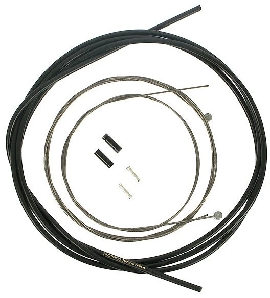 Das Shimano MTB Bremszugset besteht aus Edelstahl-Innenzügen und M-System-Bremszughülle. Die Züge weisen einen runden Querschnitt auf, welcher die Reibung reduziert, und sind korrosionsresistent. Charakteristisch für die Außenhülle ist der weiche Liner, welcher die Flexibilität des Gehäuses erhöht und eine mountainbiketypische Verlegung erleichtert. Gedichtete Endkappen werden mitgeliefert.