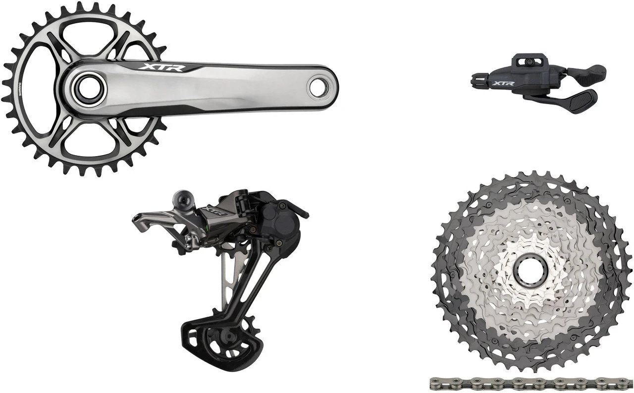 1 x Kurbel Shimano XTR XC (FC-M9100-1)1 x Kettenblatt Shimano 36 Zähne (SM-CRM95)1 x Schaltwerk Shimano XTR Shadow Plus (RD-M9100)1 x Schaltgriff Shimano XTR (SL-M9100-I)1 x Kassette Shimano XTR (CS-M9100-12)1 x Kette Shimano XTR (CN-M9100)1 x Kurbel-Lockring Shimano mit Unterlegscheibe1 x Innenzug Shimano (2050 mm)1 x Außenhülle Shimano (1800 mm)1 x Kassetten-Abschlussring Shimano Aluminium1 x Kunststoff-Spacer für Kassette1 x Kettenschloss Shimano SM-CN910-12 Quick-Link